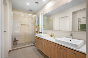 At the heart of the home, the contemporary kitchen showcases stone benchtops, a glass splashback, 900 mm appliances, and a large walk-in pantry, seamlessly connecting to the open-plan living and dining domain. Bi-parting doors open to an inviting entertaining deck, where lush garden views create a serene backdrop for everyday living.